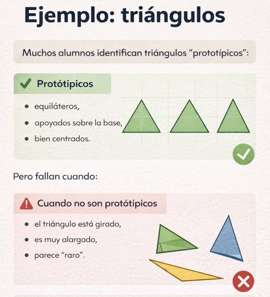 En geometría este fenómeno se vuelve especialmente visible. Pensemos en los triángulos. Muchos alumnos identifican sin dificultad los triángulos “prototípicos”: equiláteros, apoyados sobre la base, bien centrados y visualmente equilibrados. Pero empiezan a fallar cuando el triángulo está girado, es muy alargado o simplemente “parece raro”. ¿Por qué ocurre esto? Porque no han aprendido las propiedades del triángulo, sino una imagen mental concreta. Reconocen un dibujo familiar, no un concepto geométrico.